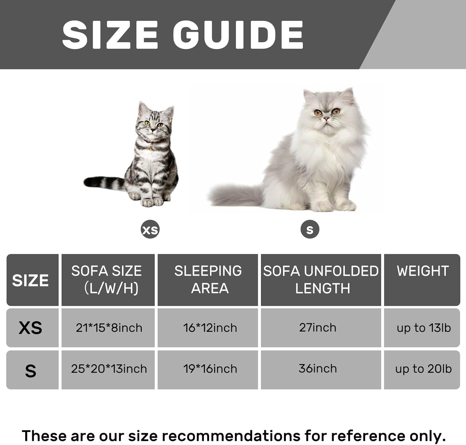 【Cat Sofa Size】 XS sofa: Sofa size is 21x15x8in, sleeping area size is 16x12in, sofa unfolded length is 27in,up to 13lb. S sofa: Sofa size is 25x20x13in, sleeping area size is 19x16in, sofa unfolded length is 36in, up to 20lb